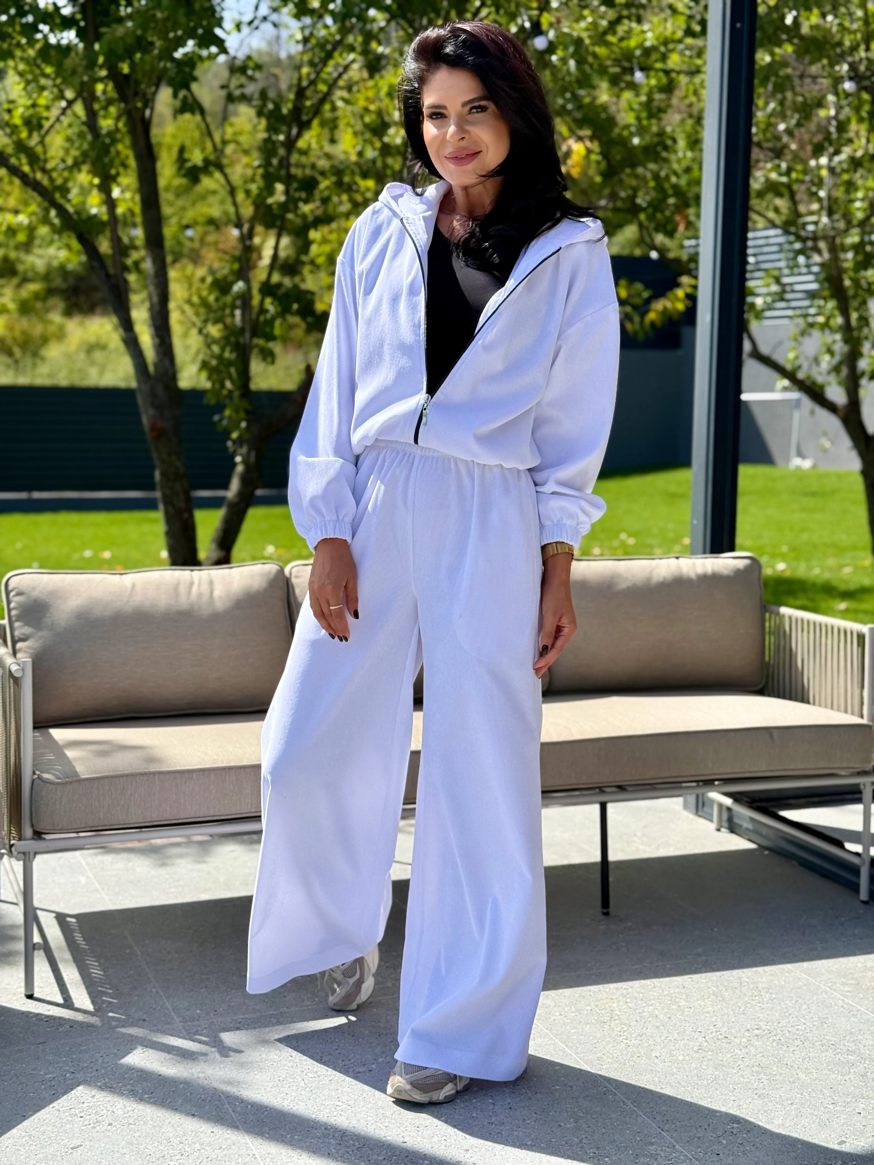 Set modern si versatil, realizat din velur catifea cu textura moale si placuta la atingere. Jacheta are croiala lejera, cu gluga practica si inchidere frontala cu fermoar, mansete elastice si talie usor stransa pentru un plus de stil si confort. Pantalonii au croi amplu, tip palazzo, cu talie inalta, elastica si buzunare.