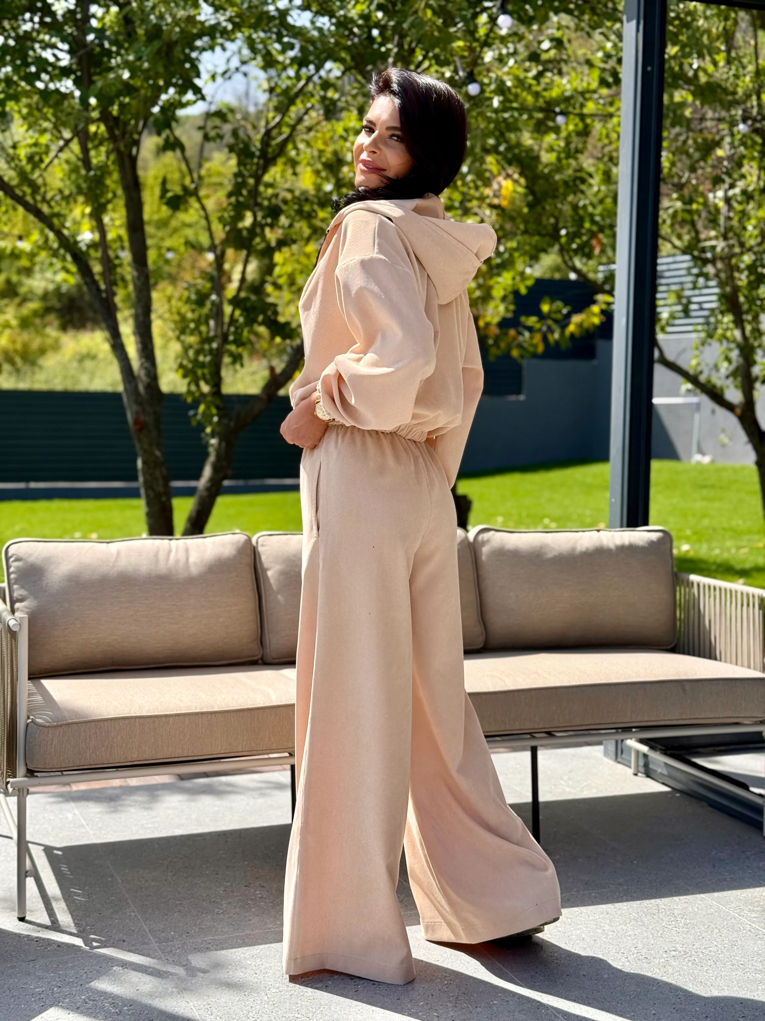 Set modern si versatil, realizat din velur catifea cu textura moale si placuta la atingere. Jacheta are croiala lejera, cu gluga practica si inchidere frontala cu fermoar, mansete elastice si talie usor stransa pentru un plus de stil si confort. Pantalonii au croi amplu, tip palazzo, cu talie inalta, elastica si buzunare.