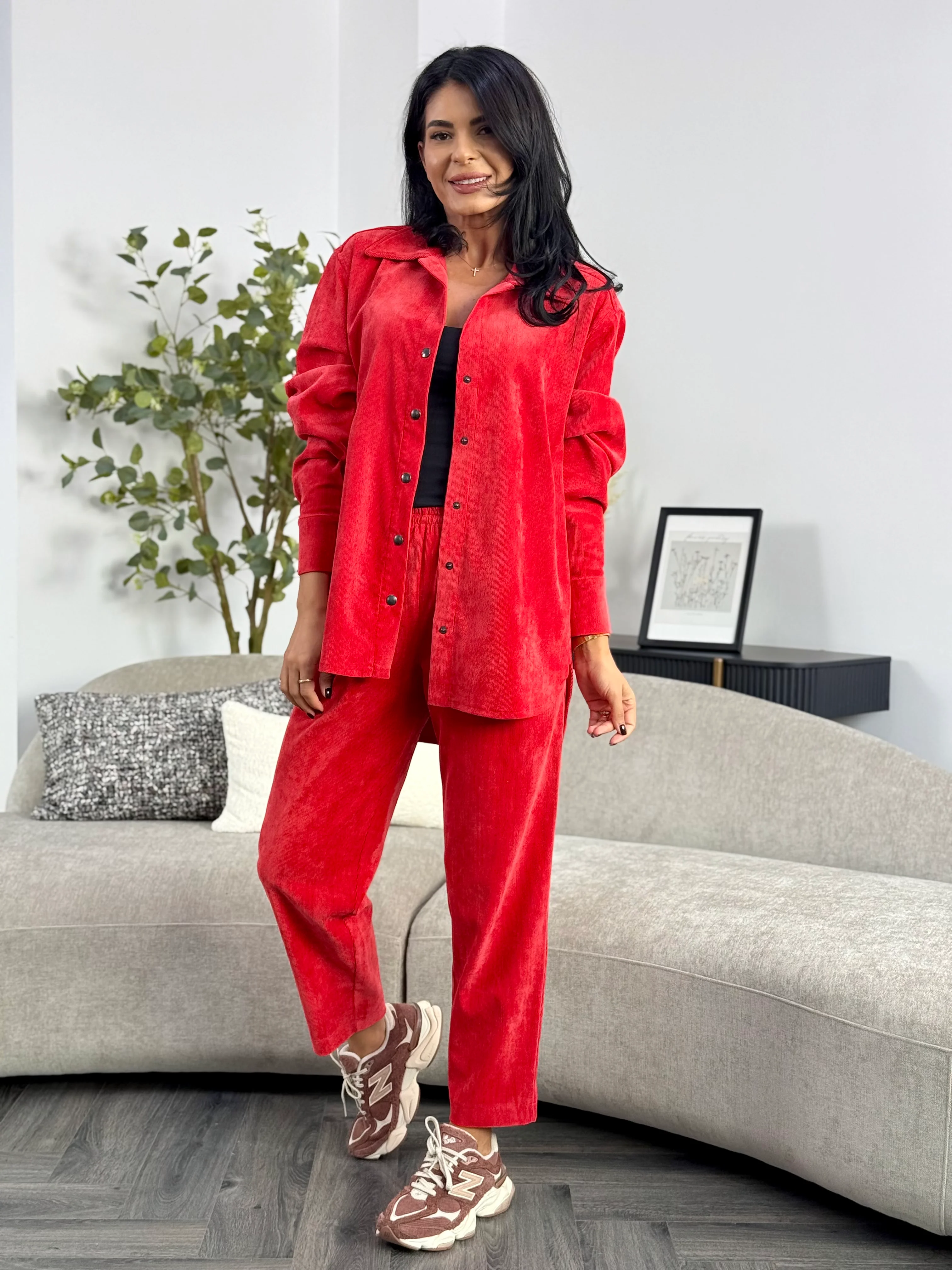 Pantalonii au talie medie, elastică și buzunare laterale, oferind lejeritate și libertate de mișcare, iar croiul drept avantajează silueta. Cămașa tip oversize, cu închidere frontală cu capse, completează setul, putând fi purtată atât deschisă, cât și închisă, pentru un look versatil.