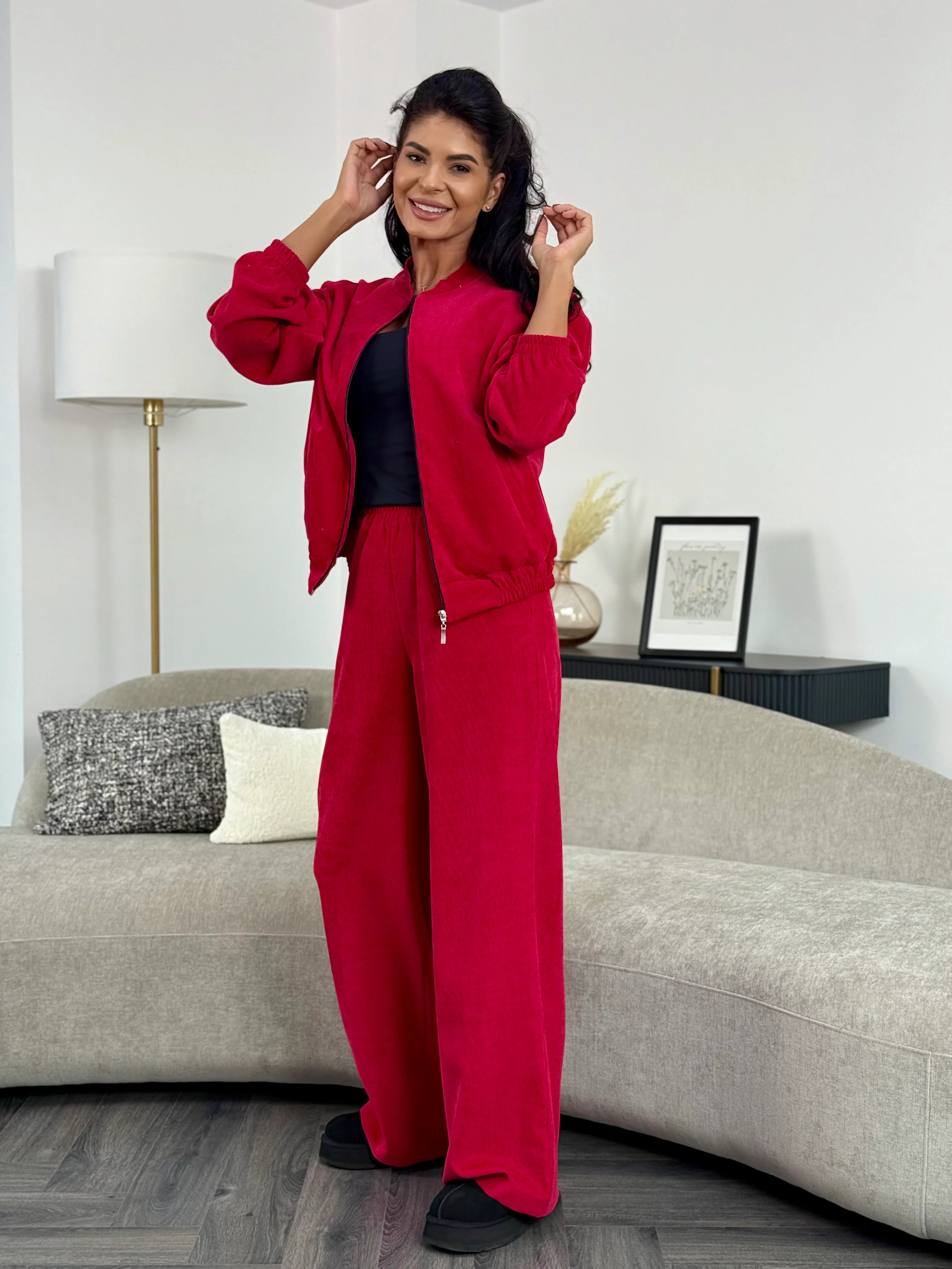 Un outfit modern și confortabil, realizat din catifea velur moale, cu un aspect elegant și plăcut la atingere. Sacoul tip bomber are croială lejeră, cu fermoar frontal și buzunare laterale practice, fiind o piesă versatilă pentru ținute casual-chic. Pantalonii au talie elastică, croi amplu și lejer, ce oferă libertate de mișcare și alungesc silueta.